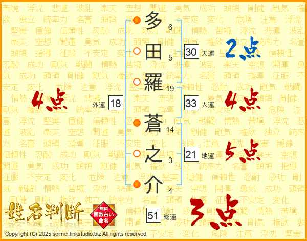 多(6画)田(5画)羅(19画) 蒼(14画)之(3画)介(4画)