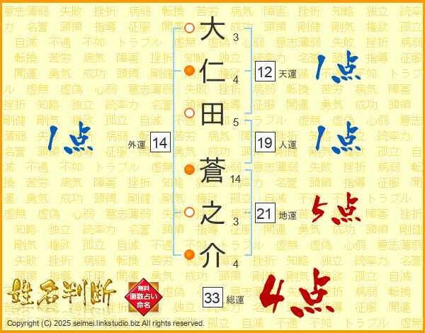 大(3画)仁(4画)田(5画) 蒼(14画)之(3画)介(4画)