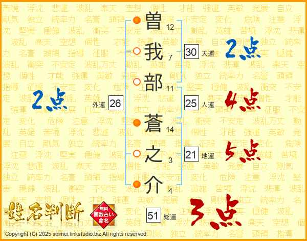 曽(12画)我(7画)部(11画) 蒼(14画)之(3画)介(4画)