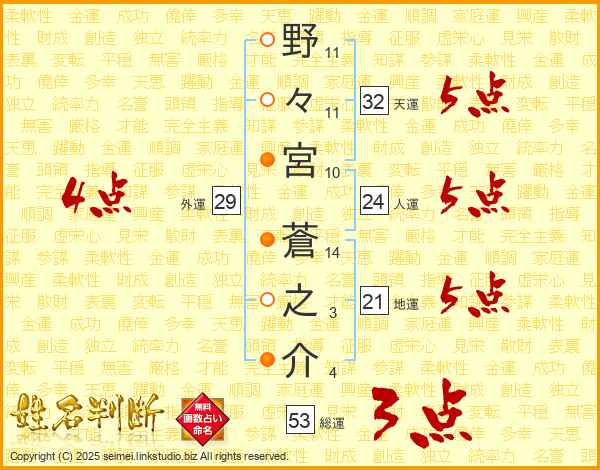 野(11画)々(11画)宮(10画) 蒼(14画)之(3画)介(4画)