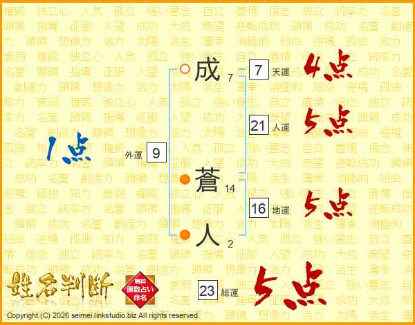 あなたの人生を表す1番重要な運勢です。生涯を通じて影響する総合運となり、主に50歳以降の晩年期に影響を及ぼします。苗字と名前の合計画数。