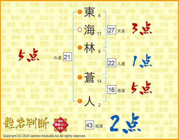 東(8画)海(11画)林(8画) 蒼(14画)人(2画)