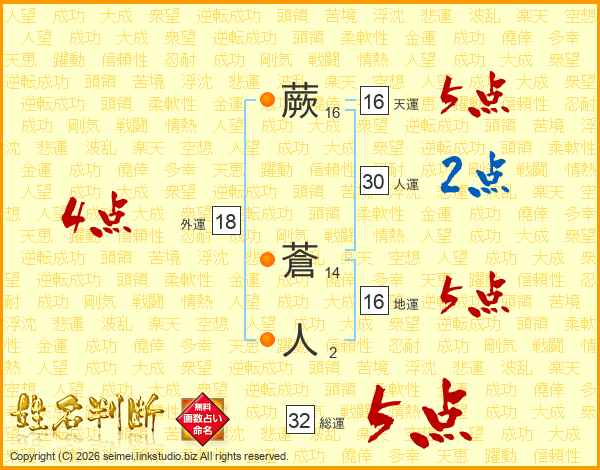 蕨蒼人さんの総運は32画の5点!