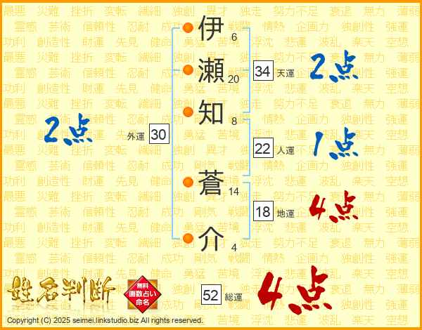 伊(6画)瀬(20画)知(8画) 蒼(14画)介(4画)