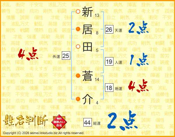 新(13画)居(8画)田(5画) 蒼(14画)介(4画)