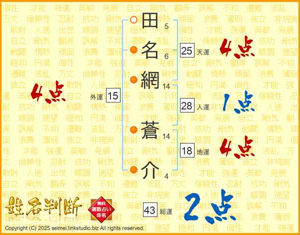 田(5画)名(6画)網(14画) 蒼(14画)介(4画)