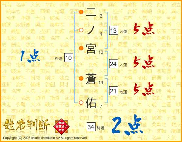 二(2画)ノ(1画)宮(10画) 蒼(14画)佑(7画)