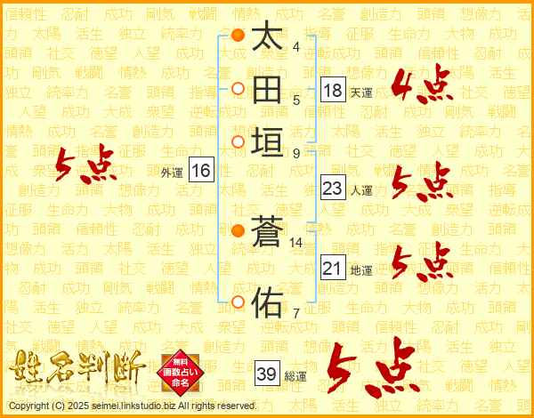 太(4画)田(5画)垣(9画) 蒼(14画)佑(7画)
