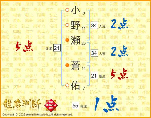 小(3画)野(11画)瀬(20画) 蒼(14画)佑(7画)