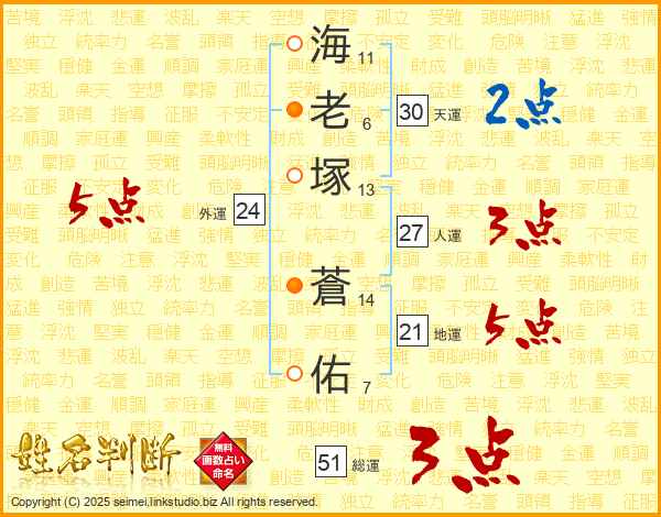 海(11画)老(6画)塚(13画) 蒼(14画)佑(7画)