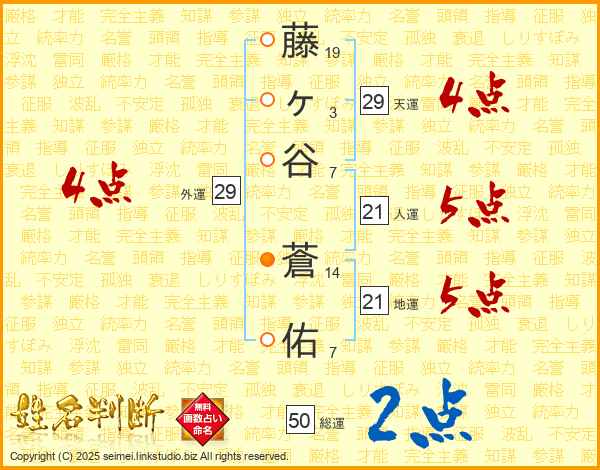 藤(19画)ヶ(3画)谷(7画) 蒼(14画)佑(7画)