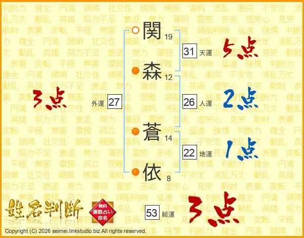 生活面を象徴する運勢です。外部から受ける影響力を表し、結婚運、家庭運や職場、環境への順応性を表します。総運から人運を引いた画数。姓や名が1文字の場合を除く。