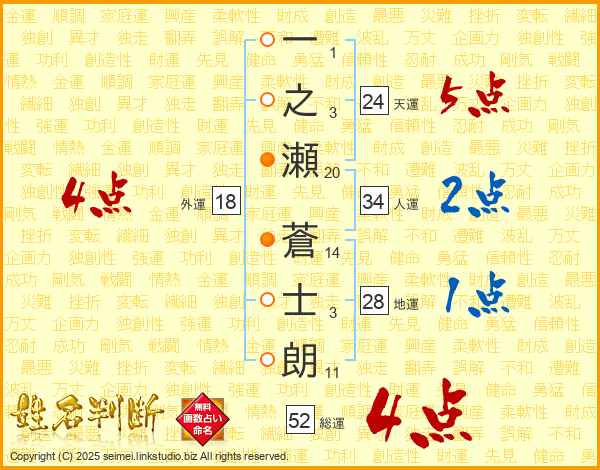 一(1画)之(3画)瀬(20画) 蒼(14画)士(3画)朗(11画)