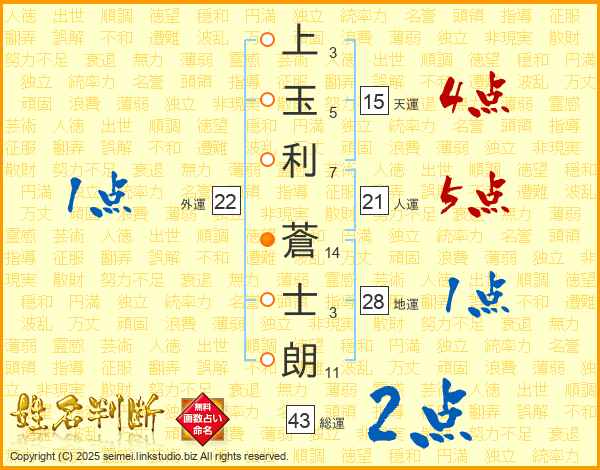 上(3画)玉(5画)利(7画) 蒼(14画)士(3画)朗(11画)