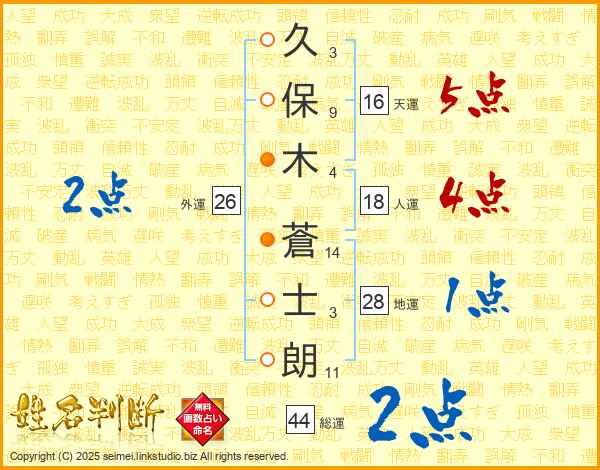 久(3画)保(9画)木(4画) 蒼(14画)士(3画)朗(11画)