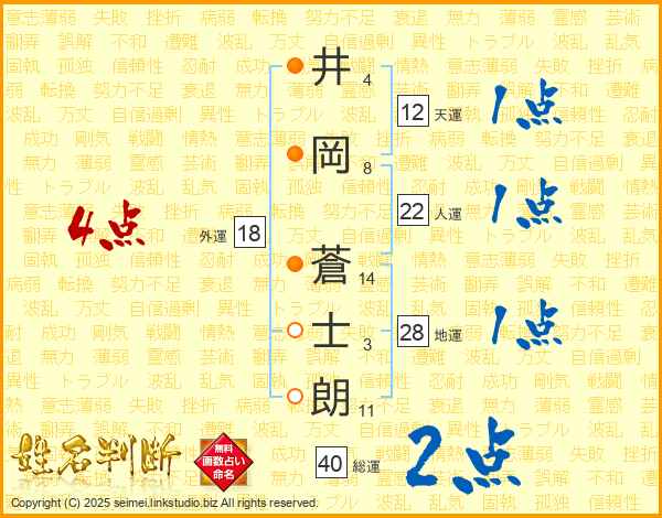 井(4画)岡(8画) 蒼(14画)士(3画)朗(11画)