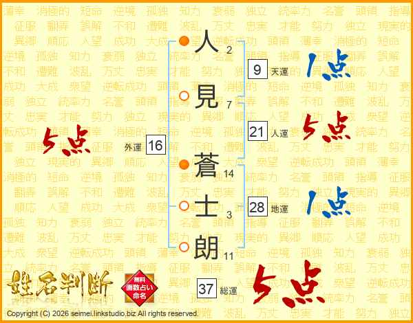 人(2画)見(7画) 蒼(14画)士(3画)朗(11画)