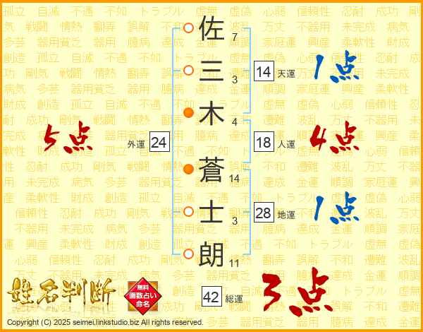 佐(7画)三(3画)木(4画) 蒼(14画)士(3画)朗(11画)