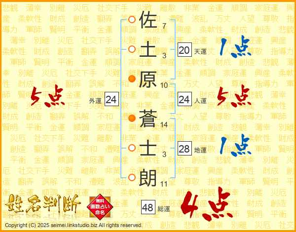 佐(7画)土(3画)原(10画) 蒼(14画)士(3画)朗(11画)
