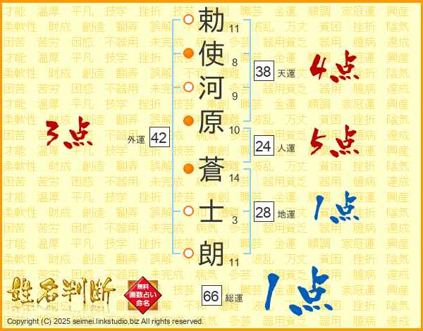勅(11画)使(8画)河(9画)原(10画) 蒼(14画)士(3画)朗(11画)