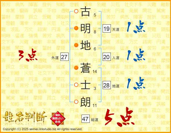 古(5画)明(8画)地(6画) 蒼(14画)士(3画)朗(11画)