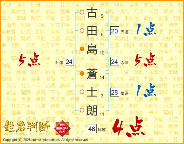 古(5画)田(5画)島(10画) 蒼(14画)士(3画)朗(11画)