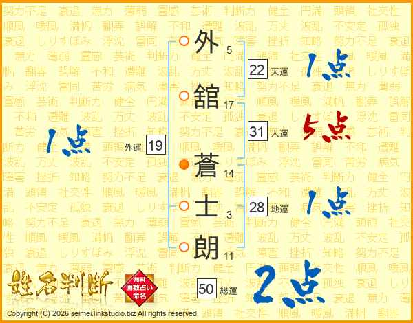 外(5画)舘(17画) 蒼(14画)士(3画)朗(11画)