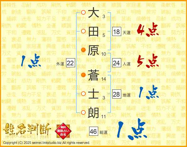 大(3画)田(5画)原(10画) 蒼(14画)士(3画)朗(11画)