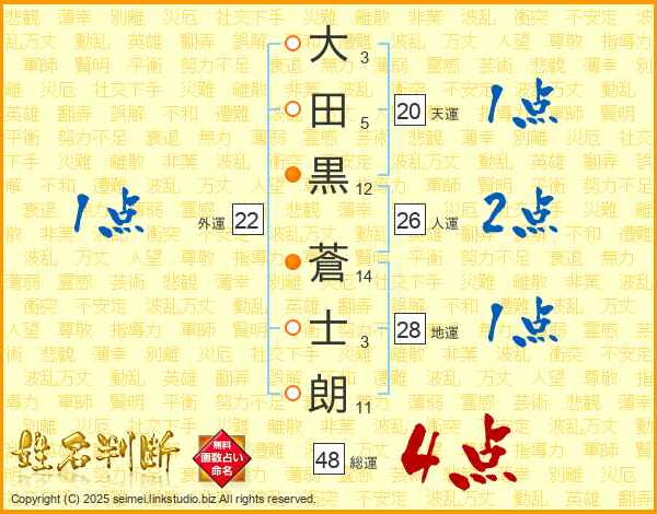 大(3画)田(5画)黒(12画) 蒼(14画)士(3画)朗(11画)