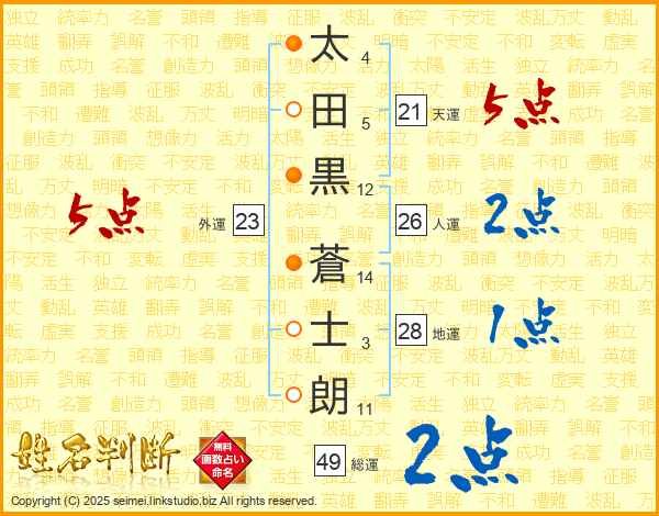 太(4画)田(5画)黒(12画) 蒼(14画)士(3画)朗(11画)