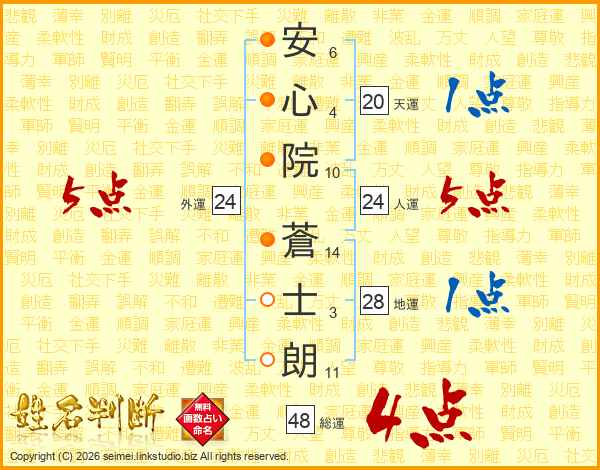 安(6画)心(4画)院(10画) 蒼(14画)士(3画)朗(11画)