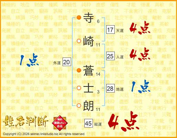 寺(6画)崎(11画) 蒼(14画)士(3画)朗(11画)
