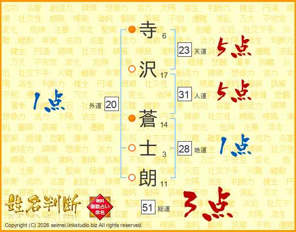 寺(6画)沢(17画) 蒼(14画)士(3画)朗(11画)