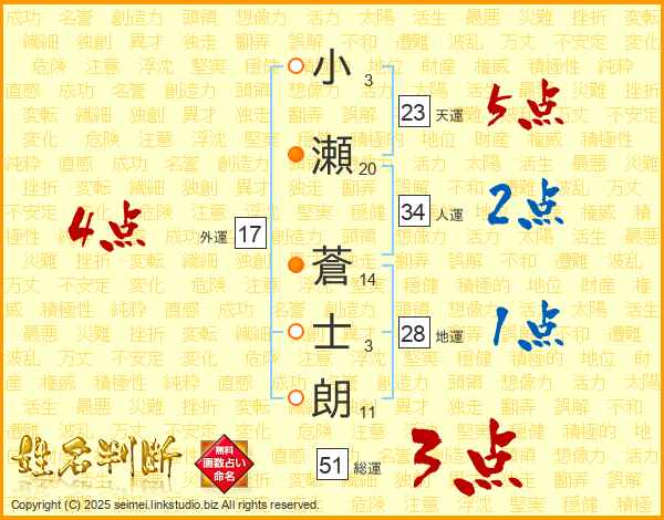 小(3画)瀬(20画) 蒼(14画)士(3画)朗(11画)