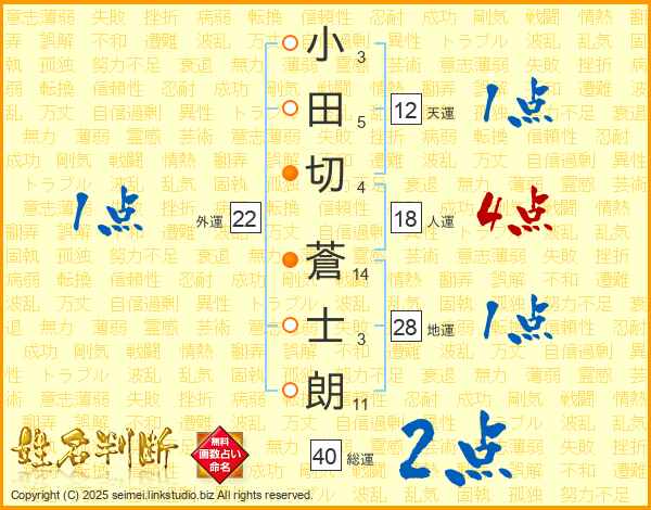 小(3画)田(5画)切(4画) 蒼(14画)士(3画)朗(11画)