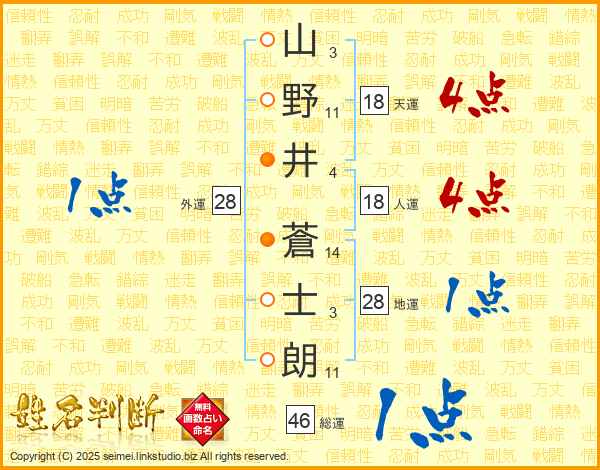 山(3画)野(11画)井(4画) 蒼(14画)士(3画)朗(11画)