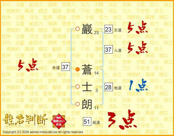 巖(23画) 蒼(14画)士(3画)朗(11画)
