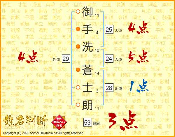 御(11画)手(4画)洗(10画) 蒼(14画)士(3画)朗(11画)