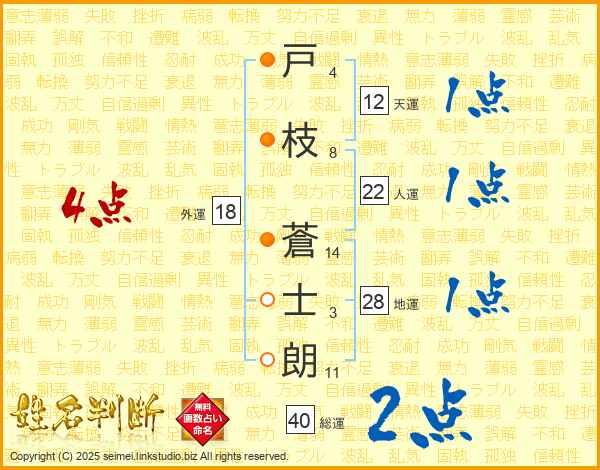 戸(4画)枝(8画) 蒼(14画)士(3画)朗(11画)