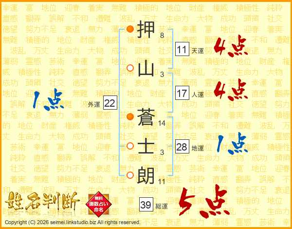 押(8画)山(3画) 蒼(14画)士(3画)朗(11画)