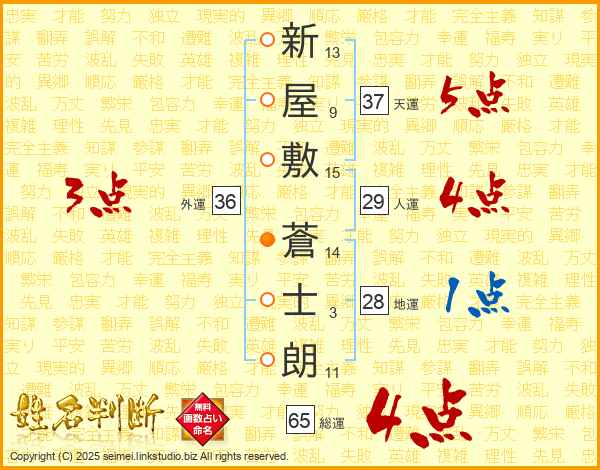新(13画)屋(9画)敷(15画) 蒼(14画)士(3画)朗(11画)