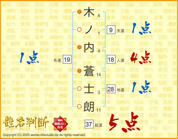 木(4画)ノ(1画)内(4画) 蒼(14画)士(3画)朗(11画)