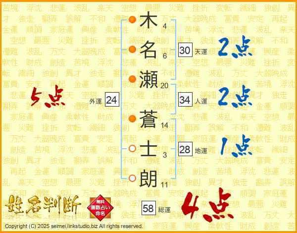 木(4画)名(6画)瀬(20画) 蒼(14画)士(3画)朗(11画)