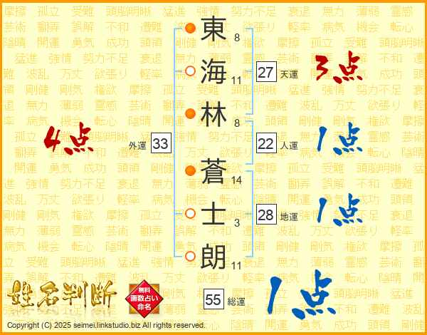 東(8画)海(11画)林(8画) 蒼(14画)士(3画)朗(11画)