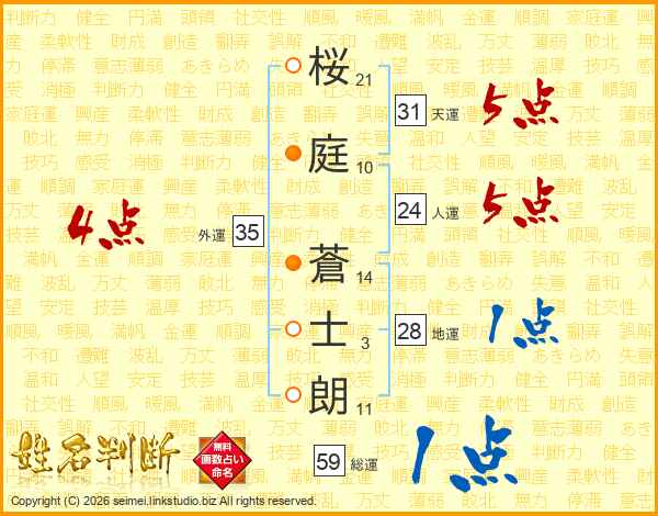 桜(21画)庭(10画) 蒼(14画)士(3画)朗(11画)