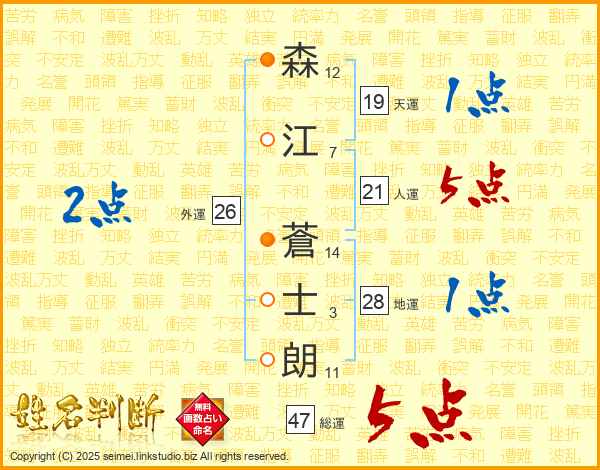 森(12画)江(7画) 蒼(14画)士(3画)朗(11画)