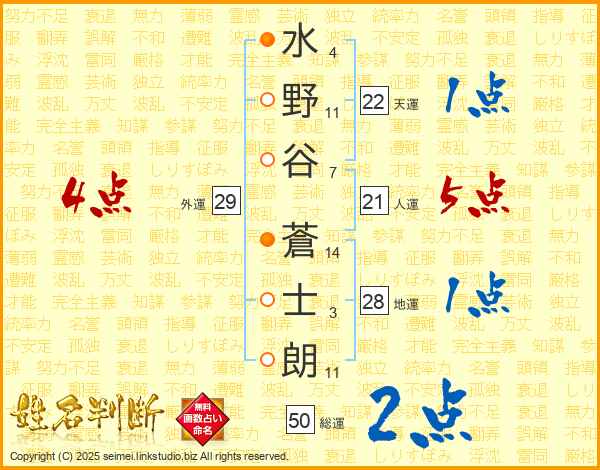 水(4画)野(11画)谷(7画) 蒼(14画)士(3画)朗(11画)