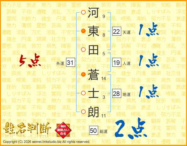 河(9画)東(8画)田(5画) 蒼(14画)士(3画)朗(11画)