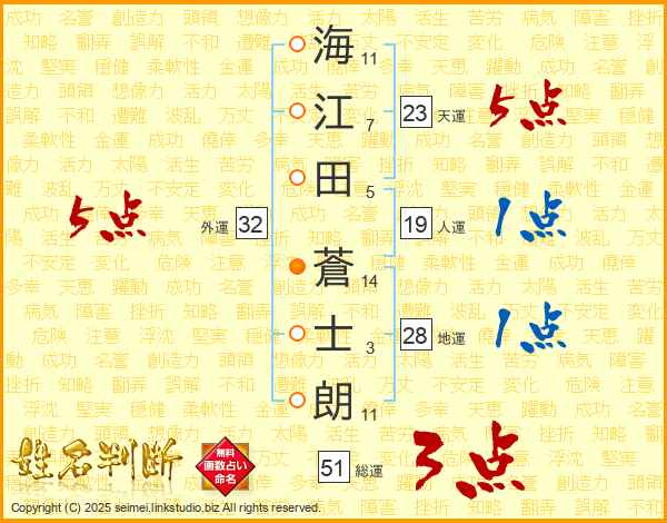 海(11画)江(7画)田(5画) 蒼(14画)士(3画)朗(11画)