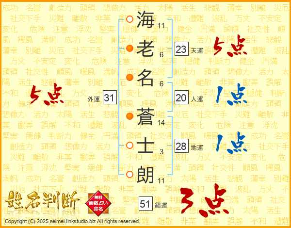 海(11画)老(6画)名(6画) 蒼(14画)士(3画)朗(11画)